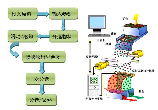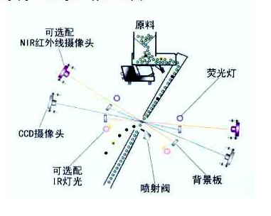 The selected material enters the machine from the hopper and vibrates through the vibrator device. The selected material enters the observation area of the sorting room along the channel and passes through the CCD sensor and the background plate. Under the illumination of the light source, the CCD receives the synthetic light signal from the selected material, which makes the system produce the output signal and transmit the amplified signal to the operation processing. The system converts the optical signal into electrical signal, and the control system sends out instructions to drive the solenoid valve to inject and blow out the discolored particles to the scrap area, so as to continue to the good material area, so as to achieve the purpose of sorting.